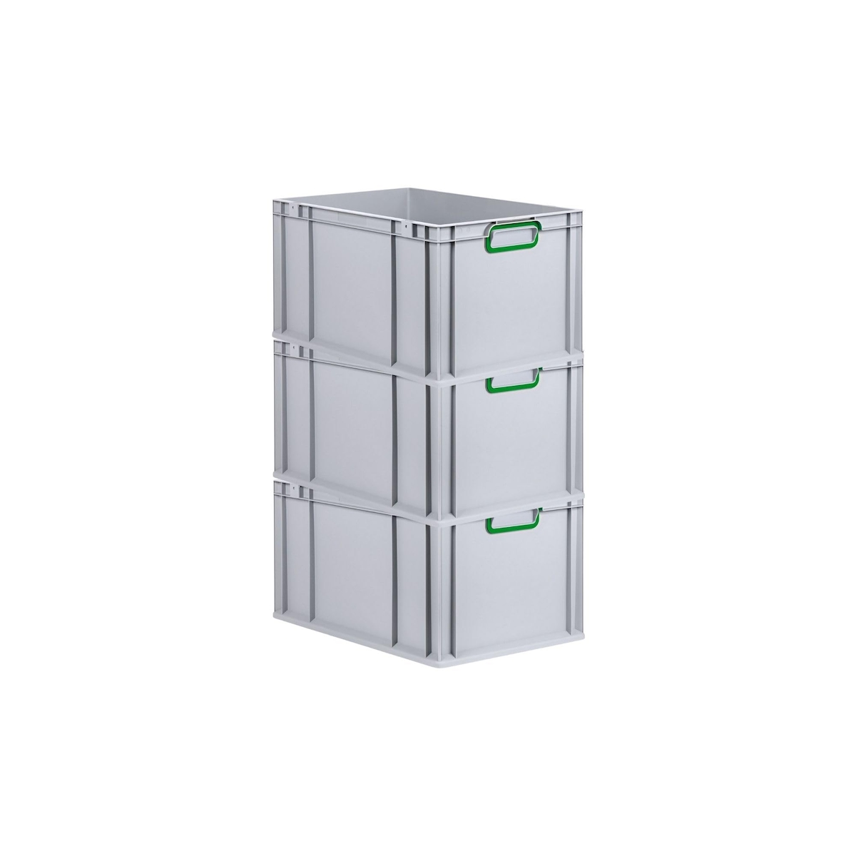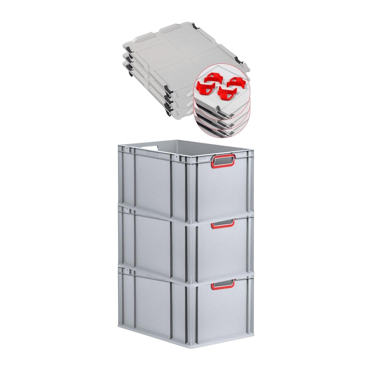 PROREGAL SuperSparSet 3x Eurobox NextGen Color mit Auflagedeckel & Verschlüsse, HxBxT 32x40x60cm, 65L, Grau, Griffe rot offen, Eurobehälter, Box