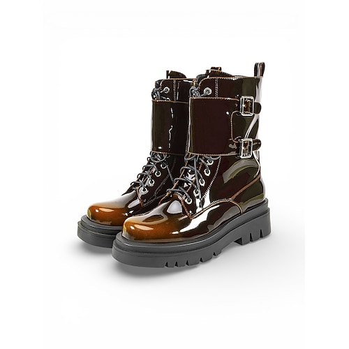 stivali da combattimento da donna in vernice verde con fibbia e suola spessa, stivali audaci per il giorno di San Patrizio, adatti a festival, sfilate, stile casual da strada e avventure all'aria aperta