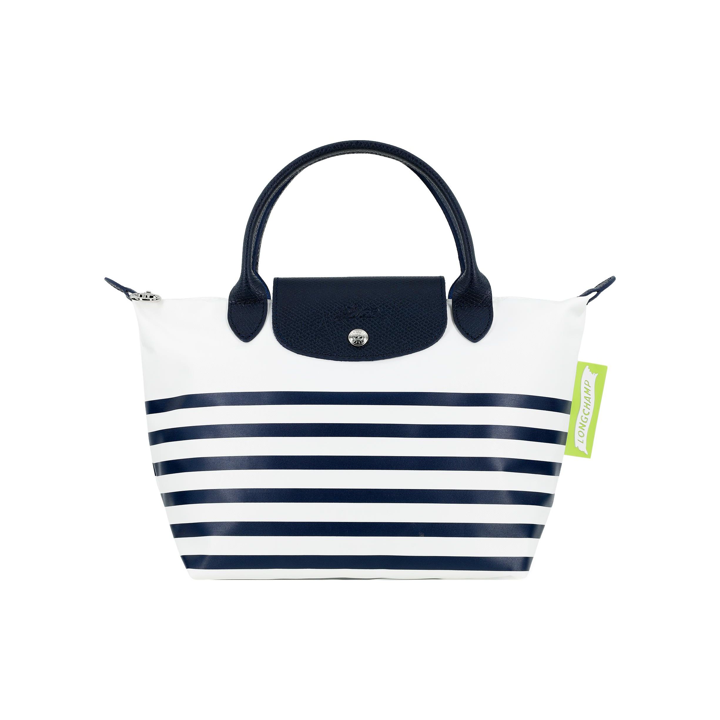 Longchamp Le Pliage 23 Rayé Fermeture à Bouton-pression et Fermeture Éclair Poignées Courtes Toile et Cuir Sac Cabas Dumpling Petit Sac Cabas Femme Bl
