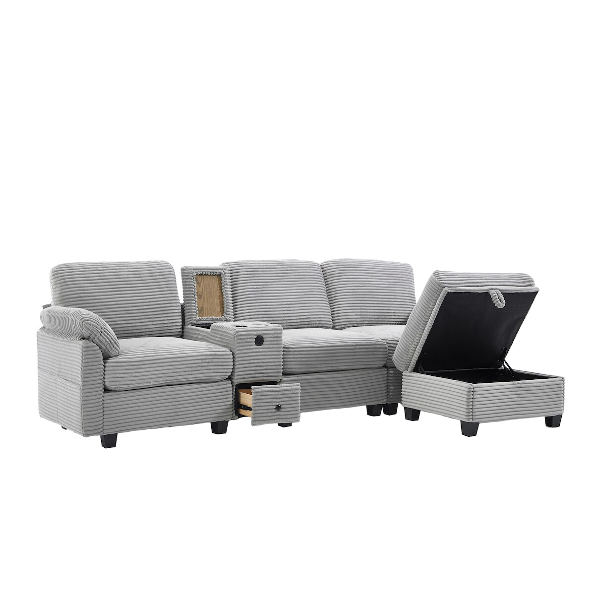 STILVORA Großes Cord-Sofa 266x136x82 cm mit memory Foam Hellgrau, USB-C-Anschluss, Stauraumhocker und praktischer Mittelkonsole