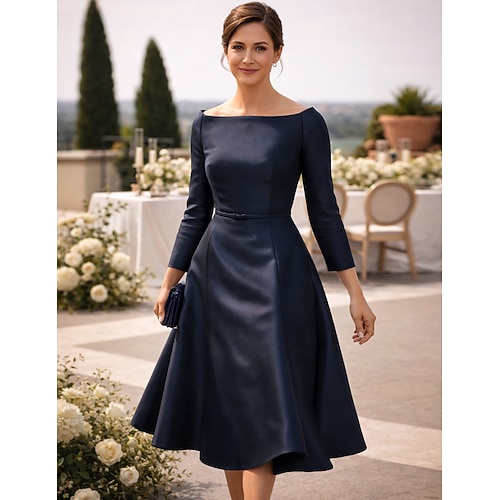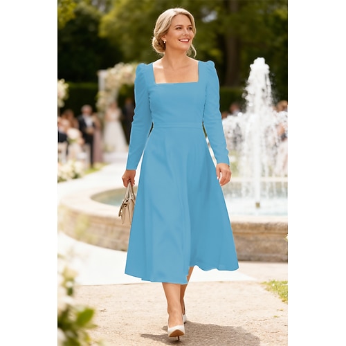 Linea ad A Lunghezza Tè Vestito da Festa Abito da Cocktail Abito da invitata a nozze Abito da cerimonia per signora Manica Lunga Collo quadrato Elegante Ospite di nozze Festa di fidanzamento Ferie