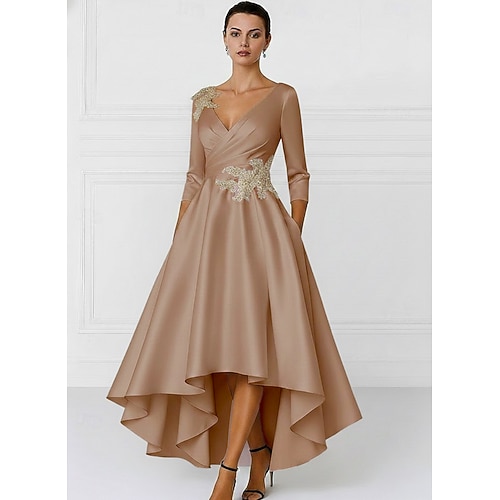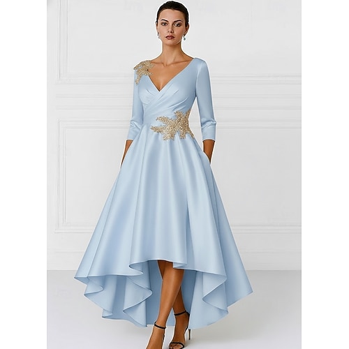 Linea ad A Asimmetrico Vestito da Festa Abito da Cocktail Abito da invitata a nozze Abito da cerimonia per signora Manica Lunga Scollo a V Elegante Formale Raso con Applicazioni