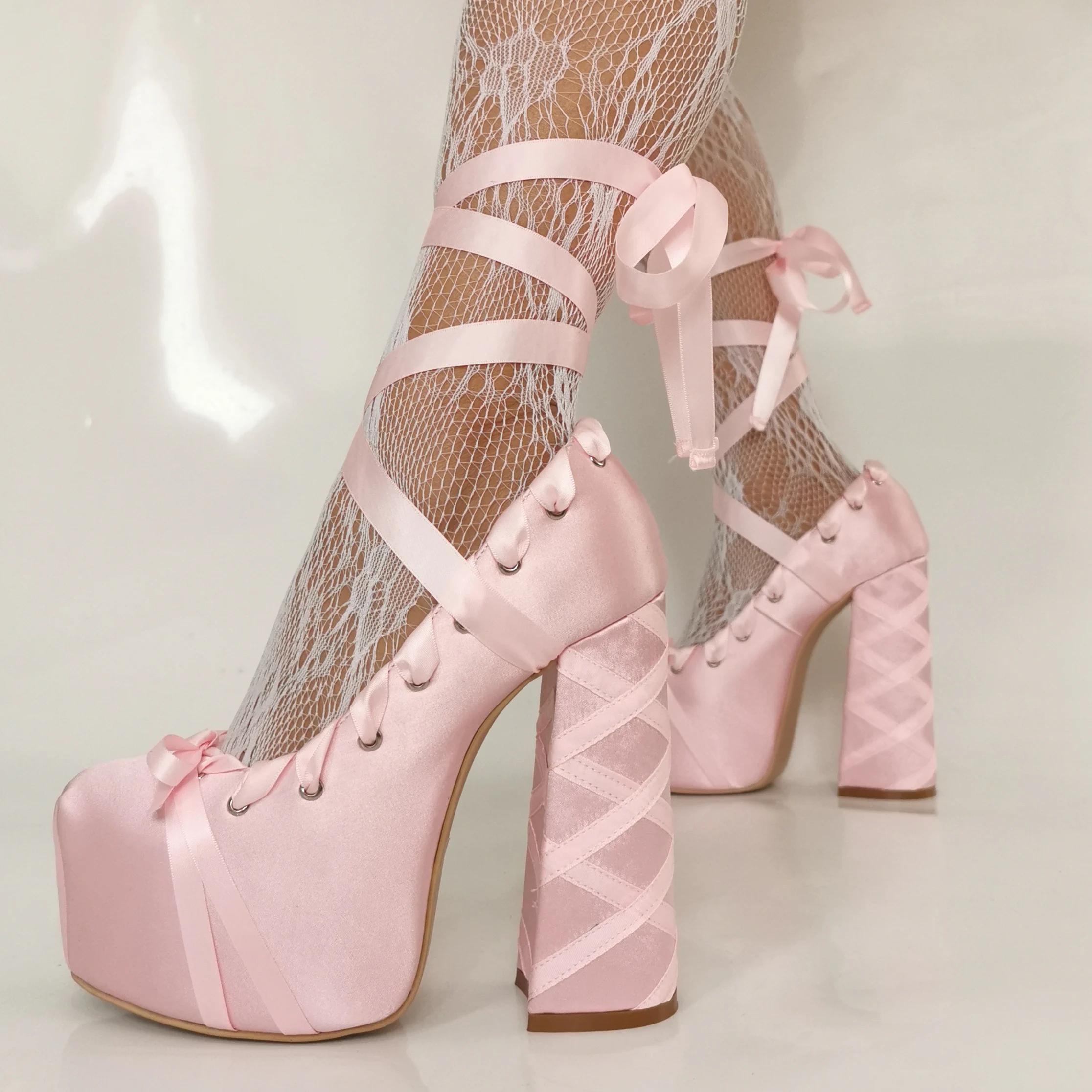 2025 New Lolita Pink Sandals Sweet Strappy Platform Thick Heel Large Size 47 Women's Pumps Satin Bow Tie Lace-Up Fashion Sandals cm light pink