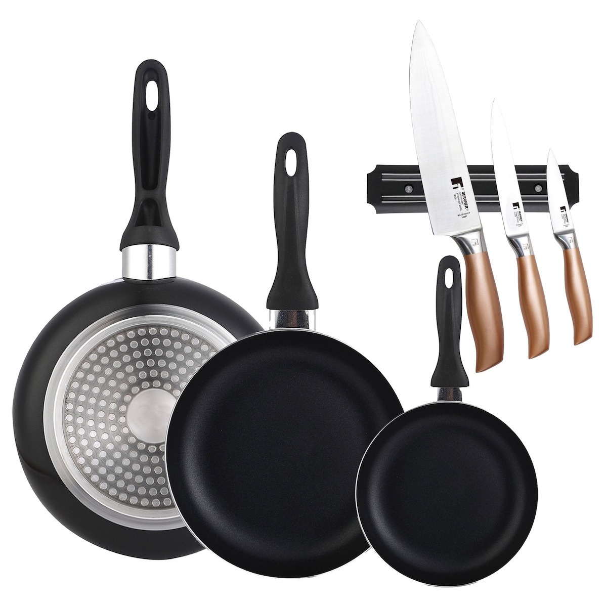BERGNER - Set aus 3 Pfannen Ø16/20/24cm aus gepresstem Aluminium in schwarz mit 3-teiliges Edelstahlmesser-Set mit magnetischer Wandhalterung