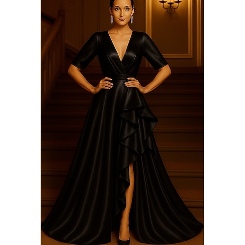 Linea ad A Lunghezza al pavimento Abito da Sera Da principessa Abito formale Elegante Mezza Manica Scollo a V Matrimonio Formale Raso con Pieghe Volant