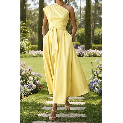 Linea ad A Lunghezza alla caviglia Lunghezza Tè Abiti da Cocktail Elegante Senza Maniche Monospalla Festa in giardino Matrimonio Raso Elasticizzato con Fiocco/Fiocchi Arricciato