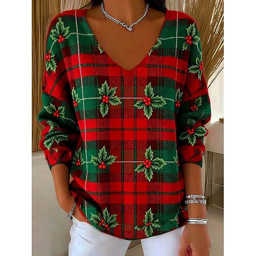 Maglione da donna di Natale Pullover Moda Vintage Streetwear Grafica Geometrica Plaid Collo a V Oversized Tricot Stampa Maniche Lunghe Tops Regolari Knit Esterno Giornaliero Festivo Vino Autunno