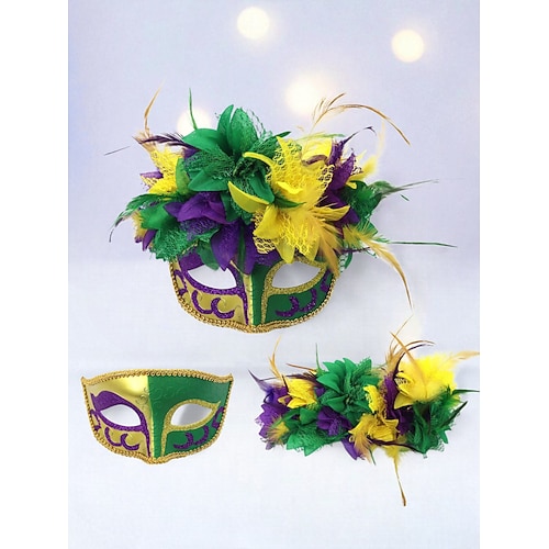 Maschera da donna in piume verdi e viola con dettagli di fiori gialli per feste di Natale, balli carnevale