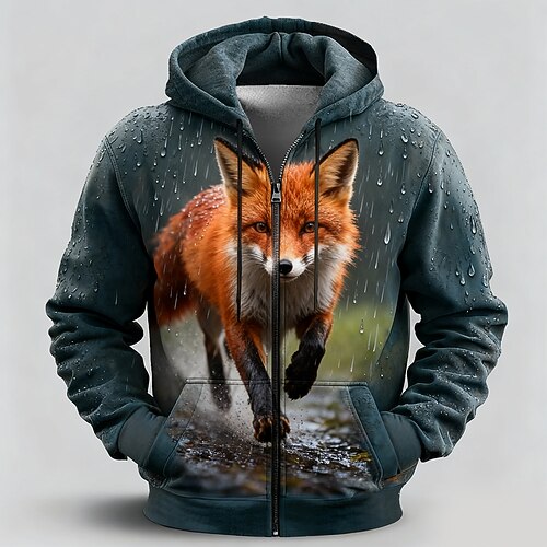 Per uomo Volpe Stampa 3D Felpa con Cappuccio Giacca di pelle Felpa Fantasia Stampa su tutta la superficie Con cerniera Vacanza Uscire Abbigliamento casual alla moda Arancione Blu scuro Grigio Cerniera