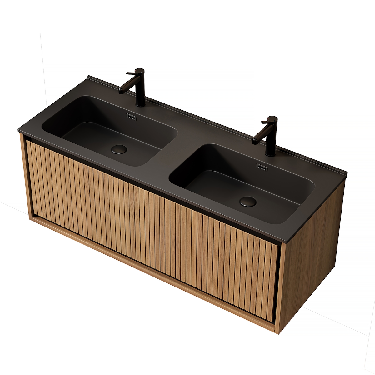 MODFU Waschtisch 46x121x46 mit 2 mattschwarzen Harzbecken, Espressoschrank, 2 Soft-Close Schubladen, Stauraum, Sperrholz, Modern