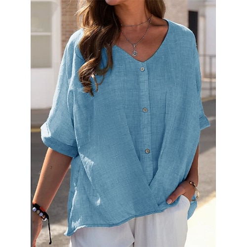 Per donna Camicia Camicie ispirate al lino Abbottonare Blusa Tinta unica Essenziale Casual Manica 3/4 Scollo a V Top Regolari Quotidiano Bottoni Rosa Blu Cachi Autunno Inverno