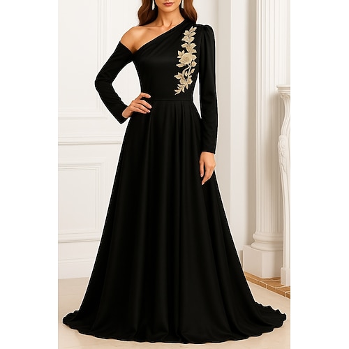 Linea ad A Lunghezza al pavimento Abito da Sera Abito formale Elegante Setoso Manica Lunga Senza Spalle Matrimonio Formale Raso con Applicazioni Tasca