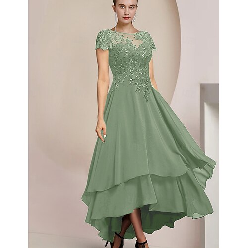Linea ad A Asimmetrico Lunghezza Tè Vestito da Festa Abito da Cocktail Abito da invitata a nozze Abito da cerimonia per signora Manica Corta Scollo Tondo Elegante Alto Basso Formale Ospite di nozze