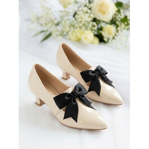 scarpe da donna in finta pelle verniciata beige, stile vintage anni '50, con tacco basso e fiocco nero, eleganti calzature retrò chic in stile edoardiano per feste e uso quotidiano