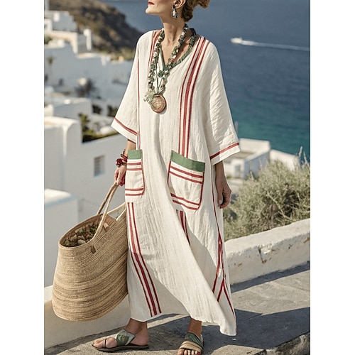 Per donna Abito maxi Abito a trapezio Abito Estivo Casual Quotidiano Vestibilità comoda A righe Manica 3/4 Scollo a V Blu Bianco Rosso Beige Estate Primavera Autunno