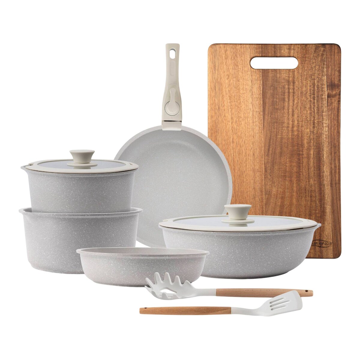 BERGNER - 5-teiliges Kochgeschirr-Set 16/18/20cm aus Edelstahl, induktionsgeeignet, mit 5 Kochutensilien aus Silikon und Akazienholz