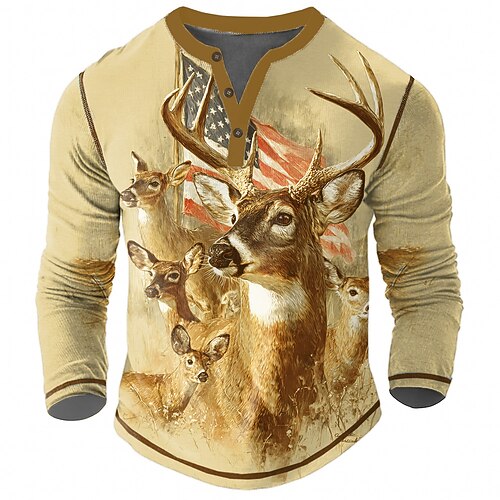 Per uomo Bandiera Americana Cervo Maglia Henley Maglietta Manica Lunga Vintage Moda Elegante Casuale Quotidiano All'aperto Autunno Primavera Autunno Thè Cachi Colletto Henley Henley Maglietta Henley