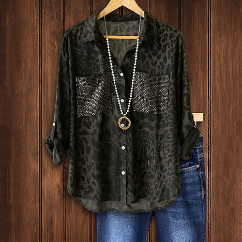Per donna Blusa Top con paillettes Leopardo Vintage Elegante Manica Lunga Colletto a Camicia Top Regolari Quotidiano Ferie Uscire Paillettes Bottoni Nero Primavera Autunno