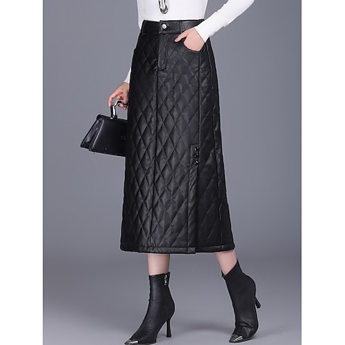 Per donna Gonna Linea A Moda Casual Midi Vita Alta Gonne Semplice Tasca Micro-elastico Streetwear Quotidiano Nero Primavera Finta pelle