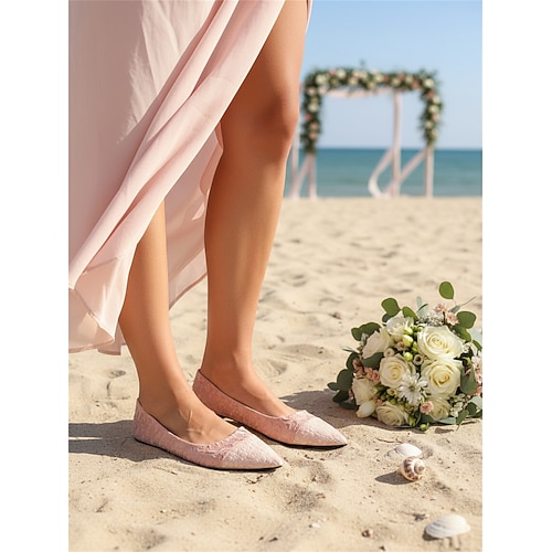eleganti ballerine in pizzo rosa da donna, punta affilata, comode scarpe da invitata per matrimoni in spiaggia