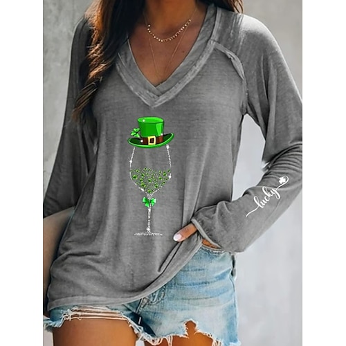 Maglietta da donna St. Patrick grafica piante elegante alla moda classica a maniche lunghe scollo a V top regolari per uscire quotidianamente fine settimana stampa blu nera verde primavera autunno