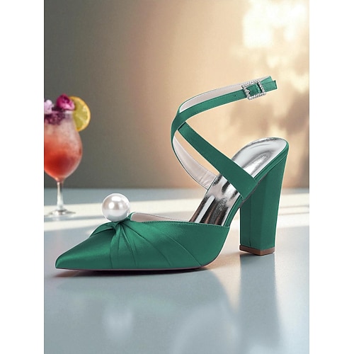 décolleté da donna con tacco a blocco in raso blu, dettagli in perle e cinturino alla caviglia - eleganti scarpe a punta per occasioni formali e cocktail party