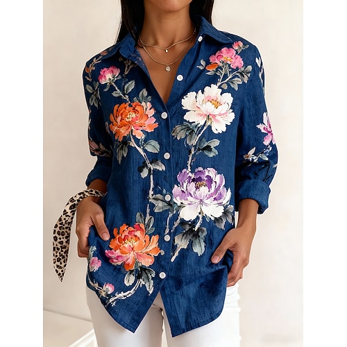 Per donna Camicia Floreale Elegante Casual Manica Lunga Colletto a Camicia Top Regolari Lavoro Quotidiano Ferie Bottoni Stampato Blu marino Primavera Autunno