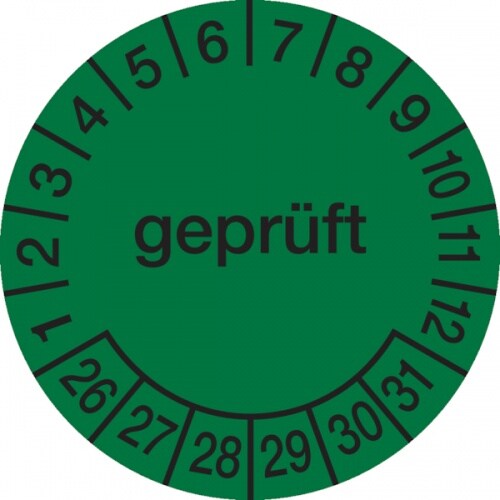 König Werbeanlagen Prüfplakette ab 26, geprüft, grün/schwarz, Folie, Ø 30 mm - Bogen = 10 Plaketten - 30 mm Folie selbstklebend