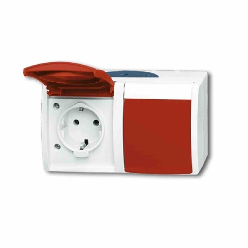 Busch-Jaeger ocean Steckdose, 2f, grau/rot, matt, Aufputz, horizontal, mit Klappdeckel, IP44, Textfeld/Beschriftungsfläche, Komplettgehäuse