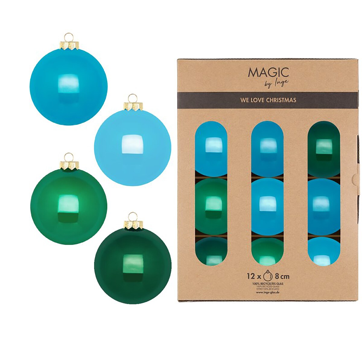 Inges Magic & Goodz 12 Weihnachtskugeln Glas 8cm matt & glänzend Christbaumkugeln Weihnachtsbaumkugeln Weihnachten Christbaumschmuck Weihnachtsbaumschmuck Grün Blau Mix