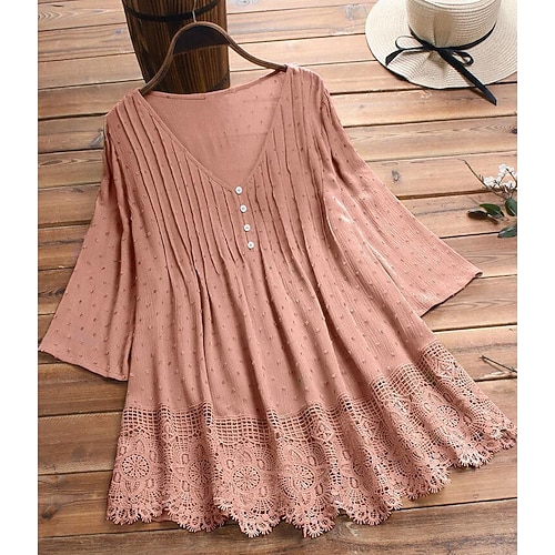 Per donna Blusa Tinta unica Elegante Essenziale Casual Manica 3/4 Scollo a V Top Regolari Quotidiano Arricciato Bordo in pizzo Nero Bianco Rosa Blu marino Verde Estate Primavera