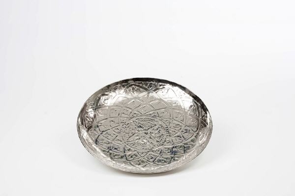 Tablett rund, verziert, Klein Höhe 4,0 cm Durchmesser 36,0 cm Gewicht 0,55 KG Aluminium vernickelt