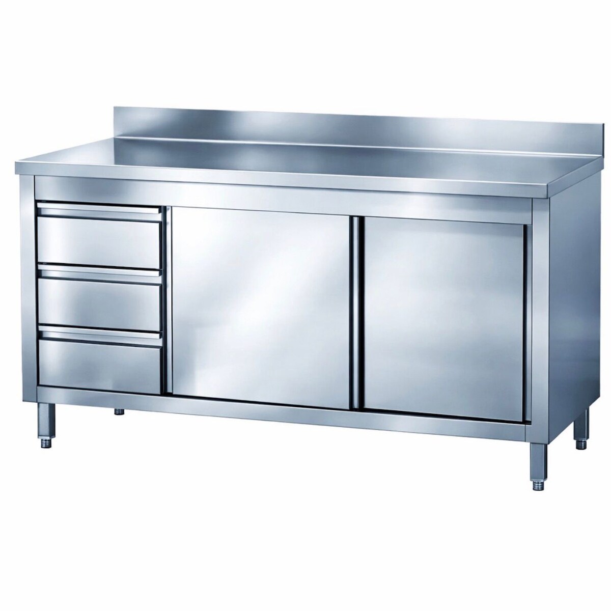 Trento Edelstahl Arbeitsschrank PREMIUM 1400 x 700 mm mit 3 Schubladen links & Aufkantung