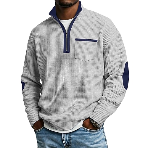 Per uomo Maglietta Waffle Maglietta Maglia Henley a nido d'ape Camicie da uomo con toppe sui gomiti Manica Lunga Collo Alto Mezza zip Autunno Inverno Tinta unica Patchwork Tradizionale / Vintage