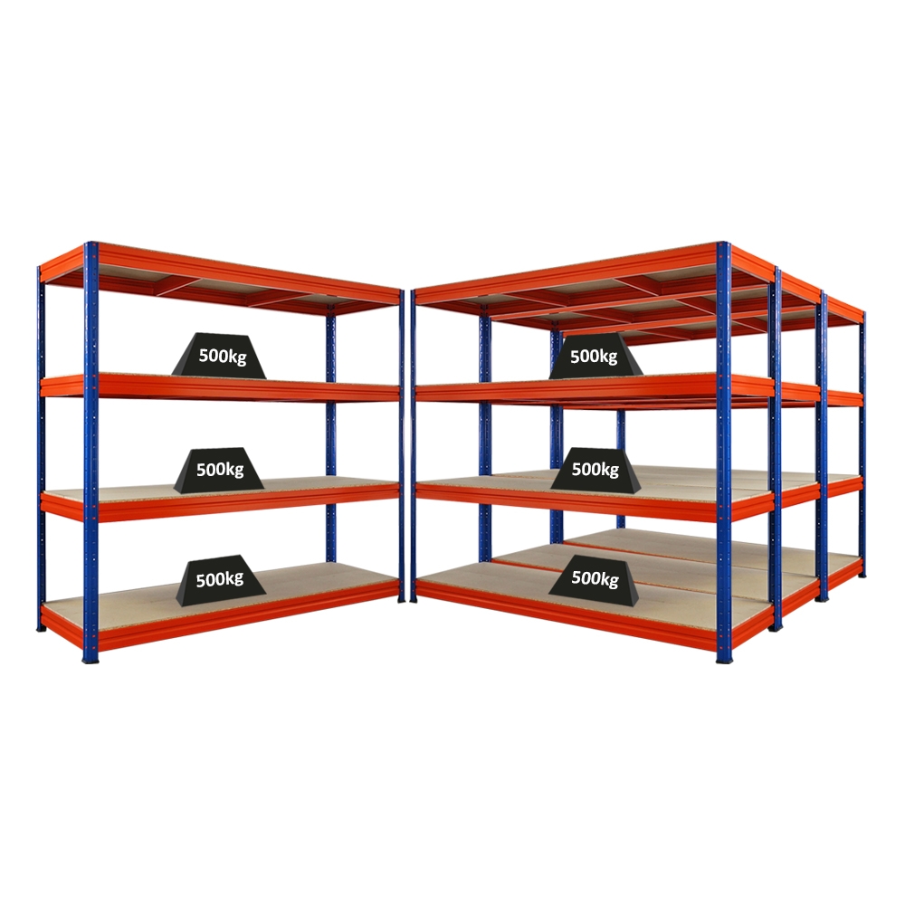 Proregal Mega Deal | 4x Schwerlastregal DINO | HxBxT 180x200x60cm | 4 Spanplatten-Ebenen 16mm | Fachlast 500kg | Blau/Orange