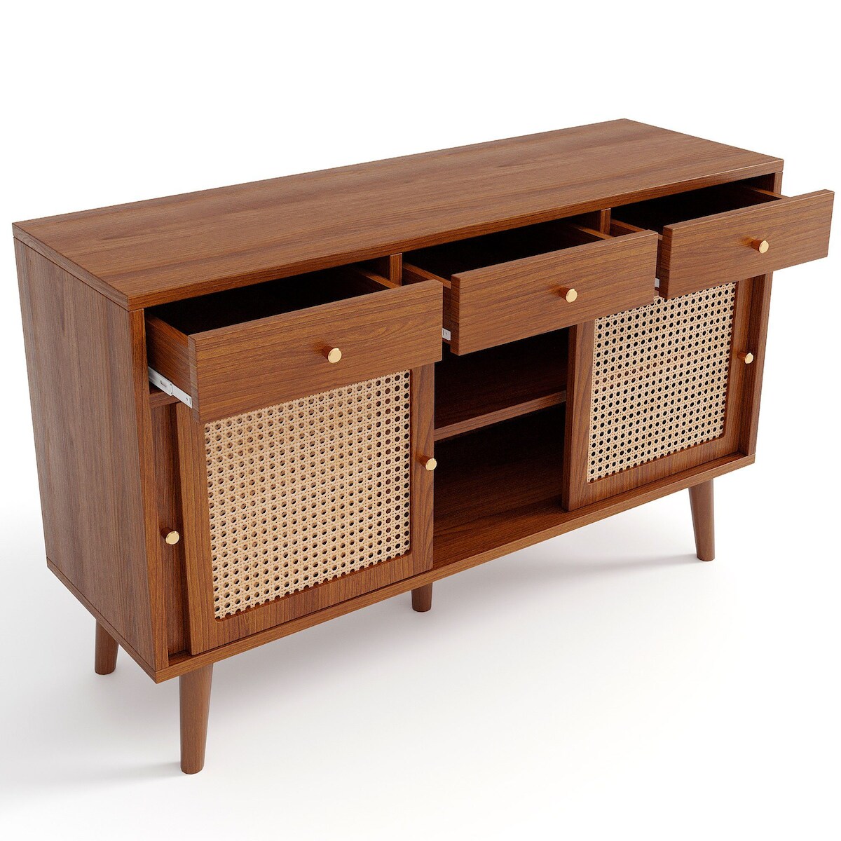 Merax Sideboard mit 3 Schubladen und 3 Schwebetüren, Rattangeflecht, Kommode mit verstellbaren Einlegböden, Anrichte, B/H/T: 120/40/78cm