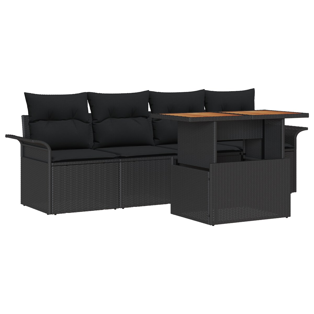 vidaXL 5-teiliges Garten-Sofa-Set mit Kissen in Schwarz, aus Poly-Rattan und Akazie