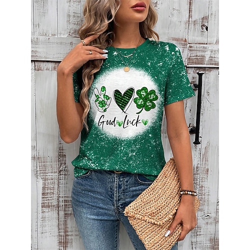 Maglietta da donna St. Patrick's Day cuore quadrifoglio moda a maniche corte colletto tondo top regolari per stampa quotidiana di San Valentino fine settimana verde estate