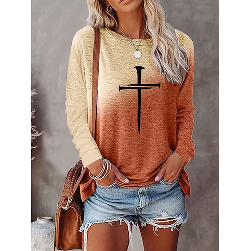 T shirt donna manica lunga girocollo tunica ombre grafica texture vintage elegante moderna girocollo top regolari stampa quotidiana blu viola arancione verde autunno prefal