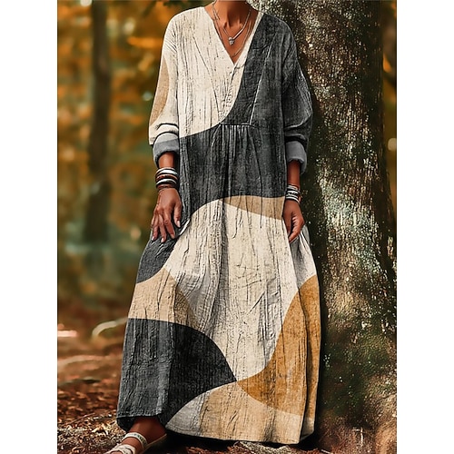 Per donna Abito maxi Vestito Estivo Abito a trapezio Vacanza Casual Boho Feste Ferie Spiaggia Vestibilità comoda Grafico Geometrico Astratto Manica Lunga Scollo a V Marrone Scuro Rosso scuro Rosso