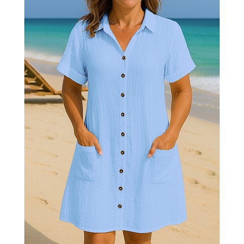 Per donna Mini Abito Misto cotone Abito Camicia Abito Invernale Casual Vacanza Vestibilità regolare Semplice Manica Corta Scollo a V Blu Nero Bianco Giallo Estate