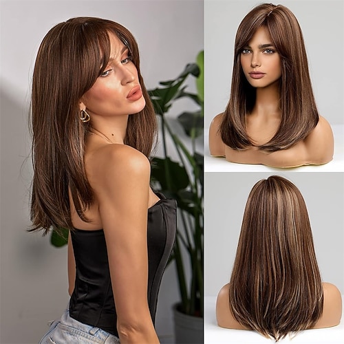 parrucche lunghe castano chiaro per donna, parrucca sintetica a strati con frangia parziale