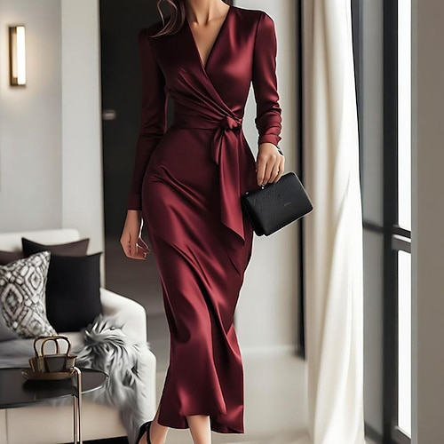 Per donna Abito Lungo Maxi Abito Abito in Raso Vestito da Festa Abito da Cocktail Elegante Moda Moderno Festa serale Feste Vestibilità regolare Semplice Manica Lunga Scollo a V Rosso Autunno Inverno