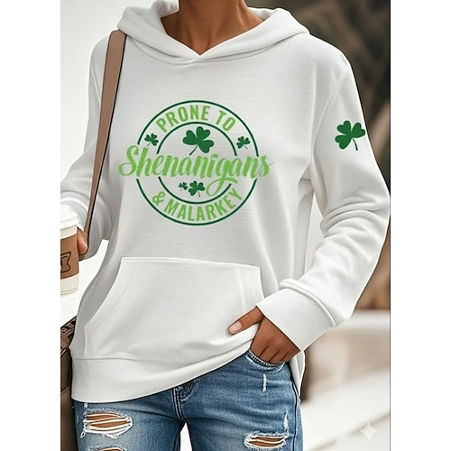 Felpa con cappuccio da donna per il giorno di San Patrizio con grafica trifoglio vintage casual a maniche lunghe colletto regolare top casual nera bianca verde primavera