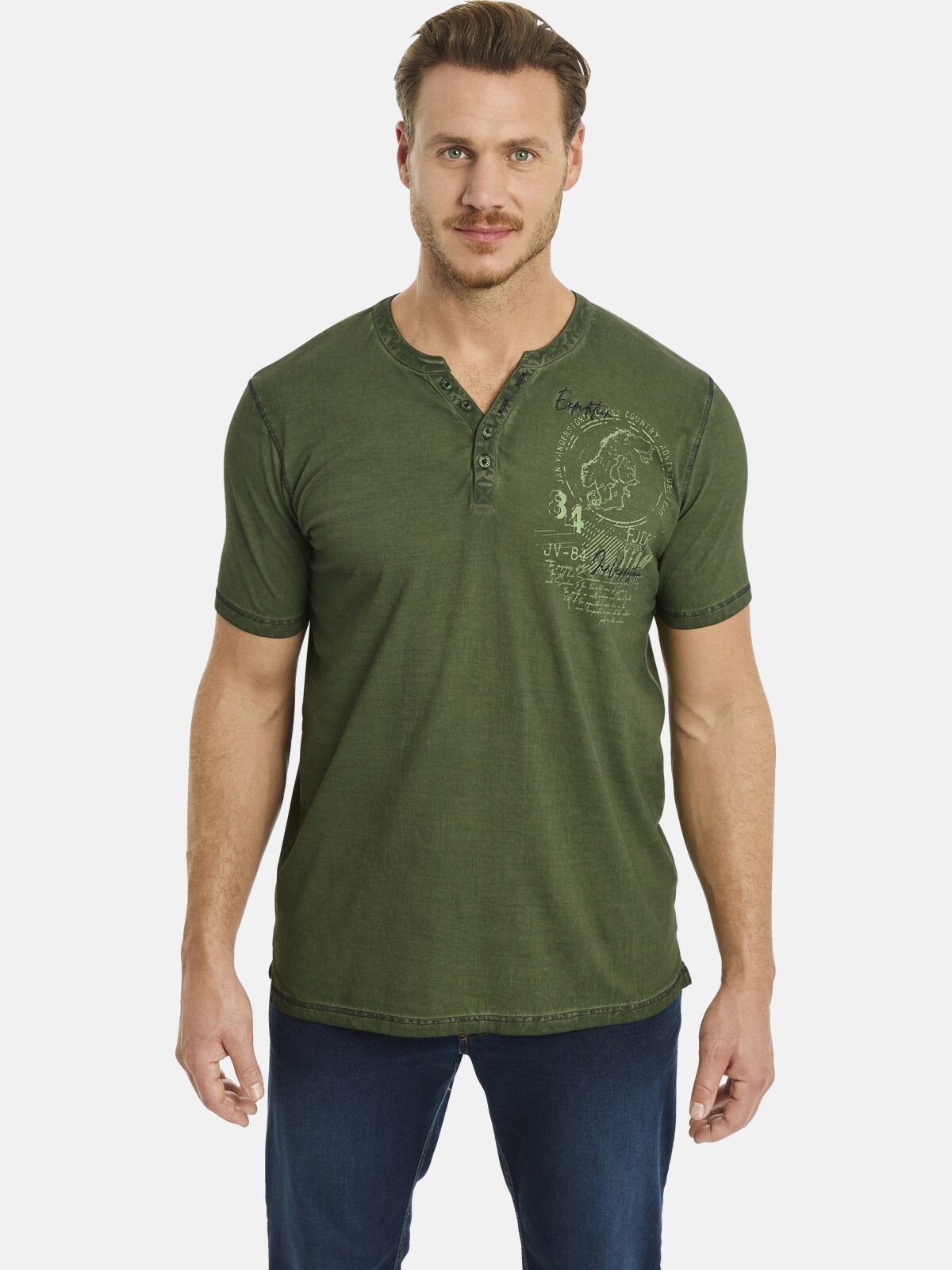 T-Shirt JAN VANDERSTORM "T-Shirt GODBERT", Herren, Gr. 4XL, grün (oliv), Obermaterial: 100% Baumwolle CO., casual, comfort fit normal, Serafino, Kurzarm, Shirts, mit Serafino-Ausschnitt