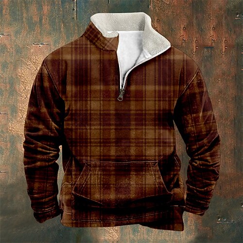 Per uomo Maglia Felpa in pile Felpa con zip corta Blu Arancione Marrone Cachi Marrone 2 Mezza zip Geometrico Plaid Zip a un quarto Sport Outdoor Quotidiano Ferie Poliestere Streetwear Essenziale