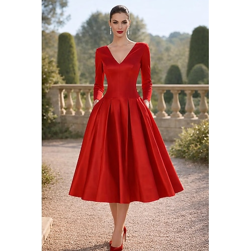 Linea ad A Lunghezza Tè Abiti da Cocktail Elegante Quotidiano Abiti semi formali Manica 3/4 Scollo a V Festa in giardino Matrimonio Raso con Pieghe