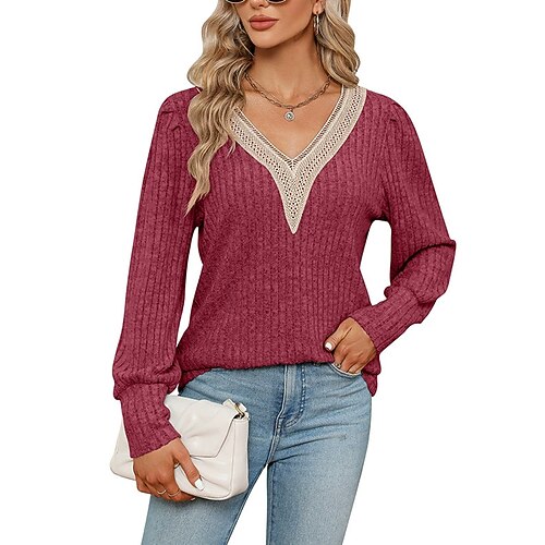 Per donna Felpa Maglione Quotidiano Elegante Casual Blocco di colori A Coste Scollo a V Lavorato a maglia Bordi in pizzo Manica Lunga Top Regolari Maglia Quotidiano Ferie Uscire Rosso bordeaux Nero