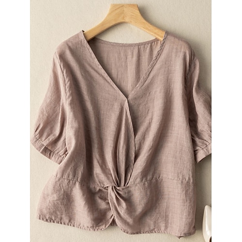 Per donna Camicie di cotone e lino Tinta unica Elegante Essenziale Casual Manica Corta Scollo a V Top Regolari Quotidiano Arricciato Blu Rosa Cachi Estate Primavera