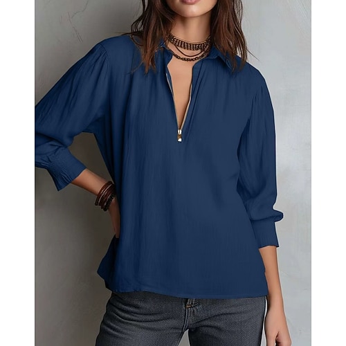 Per donna Camicia Camicie di cotone e lino Blusa Semplice Vintage Elegante Moderno Manica Lunga Scollo a V Top Regolari Quotidiano Ferie Uscire Zip a un quarto Blu Nero Rosso Verde Albicocca Estate